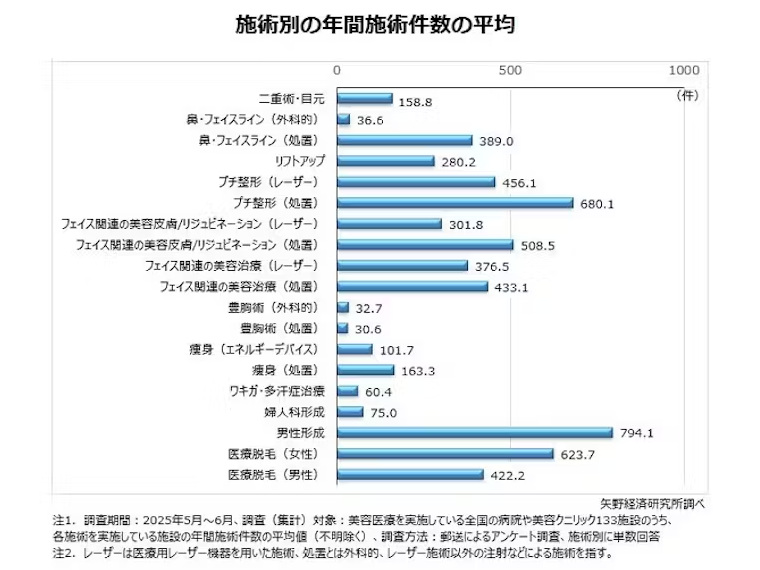 矢野経済研究所、美容外科・クニリック向けアンケート調査、施術別の年間施術件数の平均は「プチ整形(処置)」が680.1件