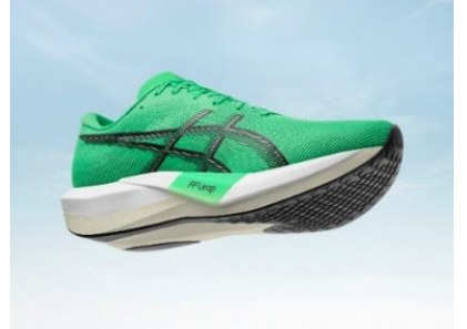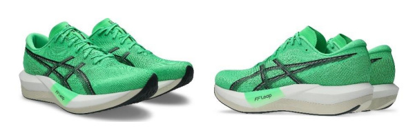 「MAGIC SPEED 5」は、レース本番だけでなくトレーニングシーンにもおすすめのカーボンプレートを搭載したランニングシューズ。同モデルは、中高生などより多くのランナーが使用できるよう、ソール全体の厚みを最大約37.5mm(40mm以下)としている。前モデルに比べて約6mm薄くなったことで、約49グラム(27.0cm/片足重量)の軽量化を実現した。また、これまで同様にカーボンプレートをミッドソール(甲被と靴底の間の中間クッション材)の前部から後部にかけて搭載し、蹴り出し時の足の動きを安定させ、効果的に身体を前方向へ推進させるようにしている。ミッドソールは、同社クッションフォーム材の中で最も軽く優れた反発性を発揮する「FF LEAP(エフエフリープ)」と「FF BLAST PLUS(エフエフブラストプラス)」を組み合わせて使用しており、上層部に「FF LEAP」を採用している。着地と同時に変形、圧縮し、素早く元の形状に戻ることで、跳ね返るような感覚が得られ、ストライドを伸ばすことが可能になる。アッパー(甲被)は、部位に応じて織り方や孔の大きさを変え通気性とフィット性を高めた「エンジニアードメッシュ」を採用している。靴底は、さまざまな路面コンディションでも優れたグリップ力を発揮する「ASICSGRIP(アシックスグリップ)」を採用している。