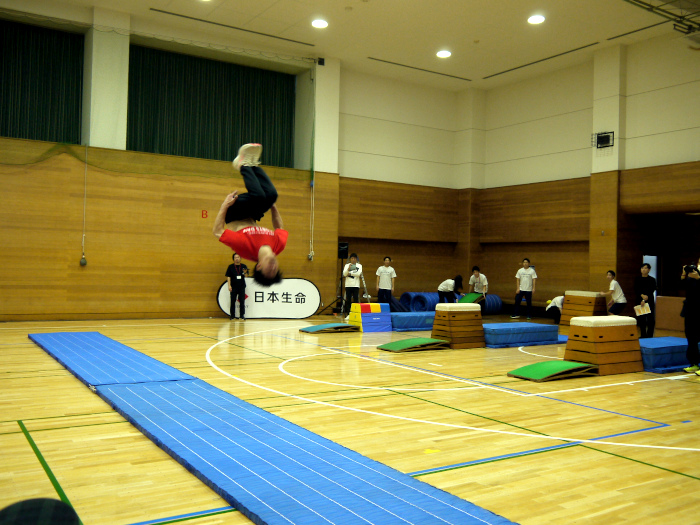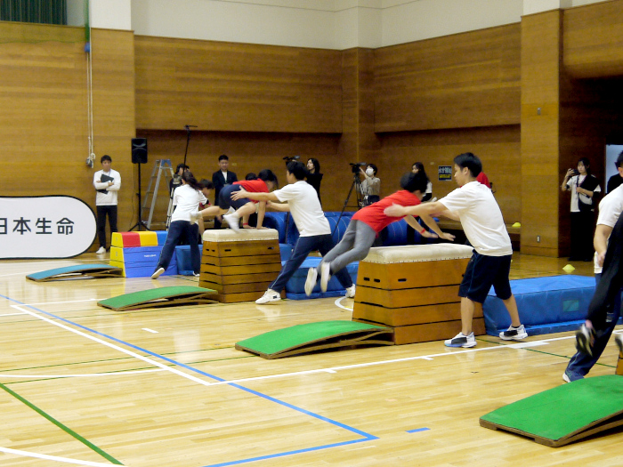 跳び箱教室を行った後は、橋本選手がマット運動と跳び箱のお手本の演技を披露。オリンピック金メダリストの実演に、子どもたちは圧倒されていた。「スポーツ教室」を終えて橋本選手は、「元気よく、怪我をすることなく終えることができて良かった。今日はみんな積極的に体を動かせていたように思う。今日だけでなく、明日以降も体育の授業などで積極的に体を動かすように心がけてほしい」と、何事にも積極的に取り組む姿勢を忘れないでほしいと述べていた。