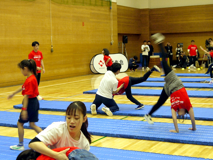 次に側転を実施。「手をマットについてから、マットをしっかり蹴り上げるとまっすぐ回れる」と、実演を交えながらポイントを解説。「怖いという子どももいるかもしれないが、しっかりサポートするので思い切ってやりきってほしい」と話すと、橋本選手のサポートを受けながら回ることができた子どもたちは、満面の笑みを浮かべていた。