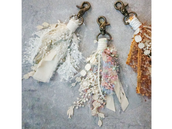 「異素材を束ねる大人の“スワッグチャーム”」(体験料 2500円)は、布やパラコードを束ねて作るスワッグバッグチャームのワークショップ。文字スタンプで好きな言葉を入れることもできる。