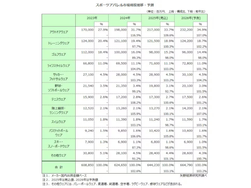 2026年のスポーツアパレル市場規模は、メーカー国内出荷金額ベースで前年比103.2%の6647億9000万円を予測する。カテゴリー別にみると、ゴルフウエアを除く11カテゴリーで成長する見通しである。その中で、2026年も引き続きアウトドアウエアがスポーツアパレル市場を牽引する可能性が大きい。日常生活での着用を目的としたライフスタイルシーンの需要拡大を背景に、2026年のアウトドアウエア市場規模は前年比107.0%を予測する。