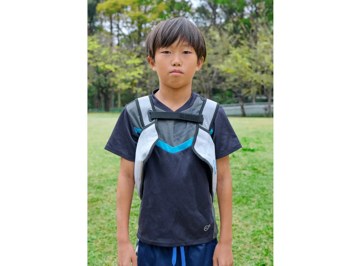 「アイスゲームベスト」は、練習中でも着用できるベスト型の暑熱対策アイテム。両脇と背中に配置された専用保冷剤(アイスパック)が、体幹部を効率的に冷却する。競技力向上のためではなく、“最後まで安全にプレーする”ためのアイテムになっている。専用アイスパックは、40℃の環境下でも5~10℃を約4時間持続。多層構造の断熱シートによって、冷気の放出を穏やかにし、持続時間の延長、接触面の冷え過ぎを軽減する。また、断熱シート表面のアルミが周囲の熱を反射することで保冷剤の温度上昇を抑えている。アイスパックのゲル化剤は食品添加物タイプを使用。人体に安心・安全なうえ、焼却して処分できることから環境にも優しい物質になっている。着るだけで冷却でき、プレーの動きを妨げないという。リバーシブル仕様(グレー/ブラック)でチーム識別が可能になっている。