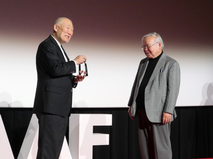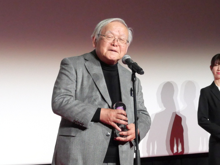 授賞式では、まず「アニメ功労部門」の顕彰が行われた。同部門は、アニメーションの技術、表現だけでなく、人材育成を含む教育活動、国際交流など、広くアニメーション産業の社会的地位の向上に貢献した人に贈られるもの。今年は、プロデューサーの松谷孝征氏(代表作品「鉄腕アトム」)、原作者の竹宮惠子氏(代表作品「地球へ・・・」)、脚本家の金春智子氏(代表作品「レ・ミゼラブル 少女コゼット」)、監督の押井守氏(代表作品「GHOST IN THE SHELL/攻殻機動隊」)、立体アニメーター/人形作家の森まさあき氏(代表作品「ガラガラヘビがやってくる」)、美術監督の山本二三氏(代表作品「天空の城ラピュタ」)、声優の小山茉美氏(代表作品「Dr.スランプ アラレちゃん」)、アニメーション史家のなみきたかし氏(代表作品「セロ弾きのゴーシュ」)、漫画家/アニメーション監督/デザイナーの安彦良和氏(代表作品「機動戦士ガンダム」)の9名が顕彰された。