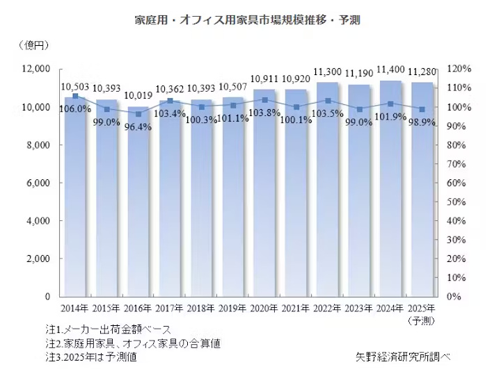2025年の家庭用・オフィス用家具市場規模はメーカー出荷金額ベースで、前年比98.9%の1兆1280億円を予測する。日常生活全般において物価上昇が続いていることから、家庭用家具においては家具自体の購入需要がある程度低下することが想定される。一方、オフィス用家具市場は従業員エンゲージメントの向上や人材採用強化を目的として、より快適なオフィス環境の構築に向けた投資が継続している。また、これらの動きは都心部の企業や大手企業だけでなく、地方の企業や中小企業にも波及していることから、オフィス家具市場は手堅い需要を維持するとみる。
