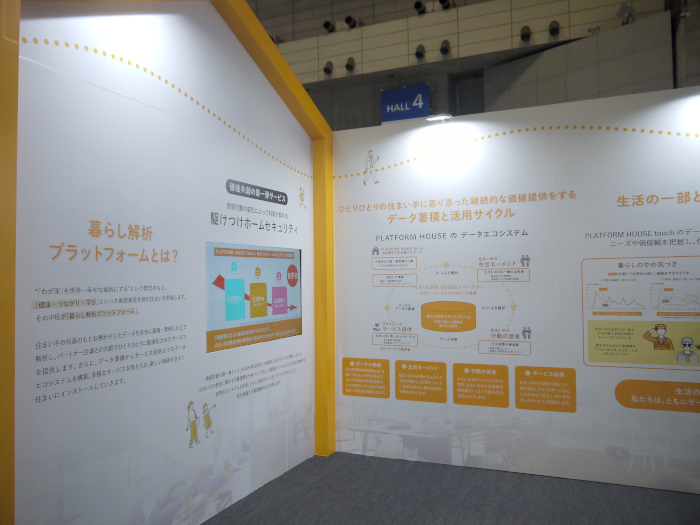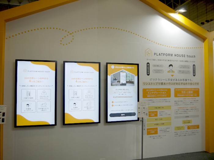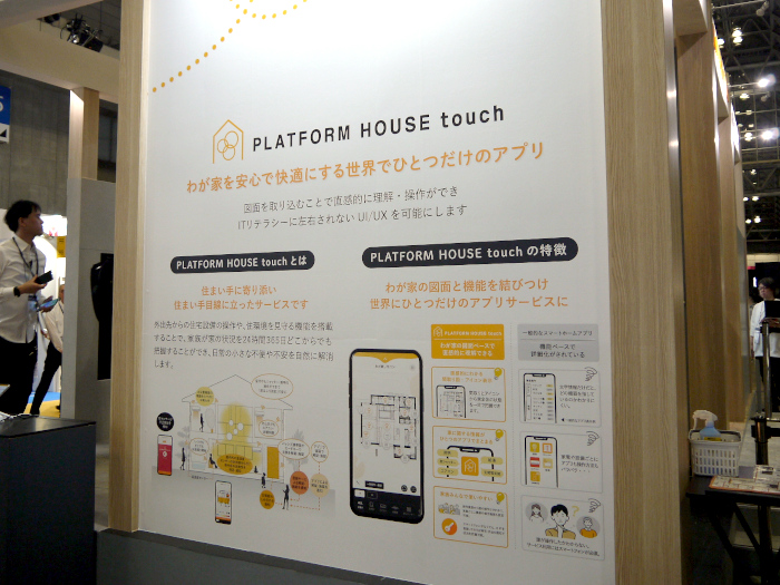 では、「暮らしのDXパビリオン」オフィシャルコンセプトブースの展示内容のポイントを紹介しよう。「PLATFORM HOUSE touch」のコーナー展示では、「PLATFORM HOUSE touch」の概要や特徴、同サービスで実現するライフスタイルなどを紹介。また、防犯対策や給湯器・エアコンの遠隔操作など、「PLATFORM HOUSE touch」の活用シーンやおすすめ利用シーンを映像展示した。