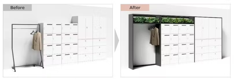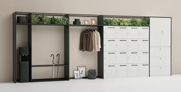 オカムラ、壁面の収納やハンガー・傘立てなどをひとつなぎに囲うことで空間に調和させるフレームシステム「Casing」を発売