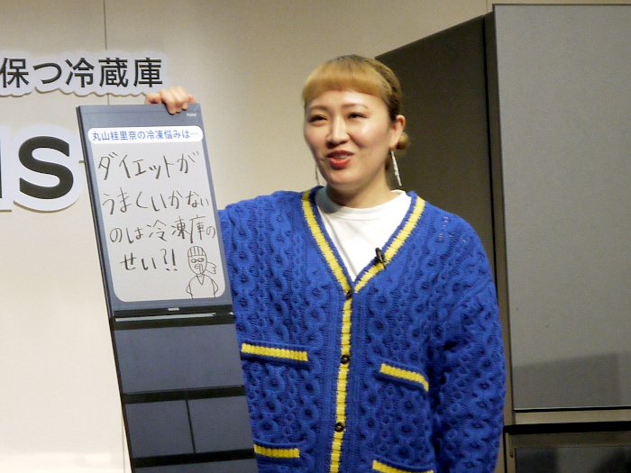 ここで、ゲストとして板野友美さんと丸山桂里奈さんが登場。二人が普段、冷凍庫・冷蔵庫を使う上で困っていることを聞くと、板野さんは、「毎日料理を作ると工数がかかるので、冷凍食品や冷凍ストックを用意している。しかし、冷凍室が小さくて足りなくなってしまったので買い足した」と、直近で新たな冷凍庫を追加したとのこと。一方、丸山さんは、「冷凍庫のせいで、ダイエットがうまくいかない」と、独特の表現で悩みを告白してくれた。