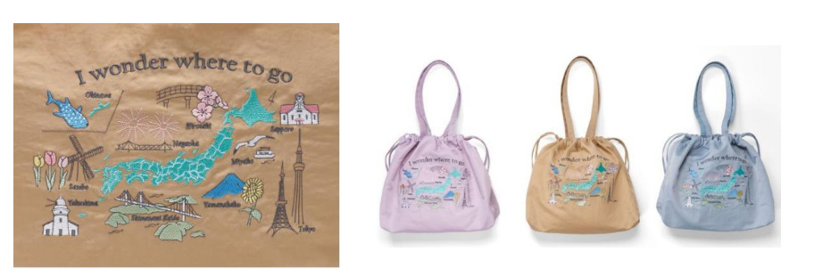 「刺繍入りドローストリングバッグ入り福袋」では、ドローストリングバッグは、日本列島のイラストマップに10エリアの観光スポットの魅力を繊細な刺繍で表現している。眺めていると思わず旅に出たくなるデザインとのこと。色はラベンダー、ベージュ、ブルーの3色展開。ドローストリングバッグを含む総額約1万1000円(税込)相当の地図柄アイテムが入っている。