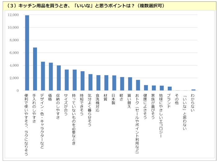 キッチン用品を買うとき「いいな」と思うポイントは、1位「便利で使いやすそう、ラクになりそう」、2位「手入れのしやすさ」だった。その道具を使うことで、作業がスムーズになり、手間が省けるものが好まれている。続いて「デザイン・色・キャラクターなど」「価格」「収納のしやすさ」があげられた。