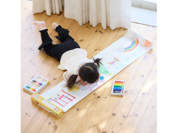 「ながーくかけちゃう おえかきロール」は、10mのロール紙なので、紙を変えたり継ぎ足したりする必要がなく、のびのび絵を描くことができる。個装箱に刃が内蔵されており、ハサミやカッターを使わずにラップのように容易に好きな長さで切り取れる。大容量のため、頻繁な買い替えが不要で、保護者の負担を軽減する。長く引き出して親子や兄弟、友だちと一緒に1枚の大作を作ることができる。