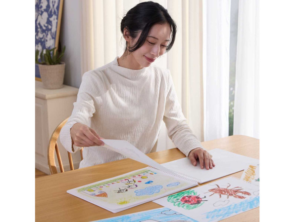 「作品を整理しやすい バインダー式おえかきちょう」は、綴じ具のリングがワンアクションで開閉できるので、作品の取り出しや差替えが簡単だとか。お気に入りの作品を1冊に整理でき、別売の追加レフィルで長く使えて経済的だという。アルバム感覚で好みの順序に綴じることができ、子どもの成長も振り返れる。透明窓付きのフレームデザインで、お気に入りの作品を表紙にして飾れる。
