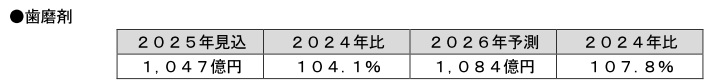 歯磨剤の2025年は、パーソナル化によって、効果効能を複合的に訴求する高付加価値商品の展開で単価が上昇している。また、「クリーンデンタル」(第一三共ヘルスケア)による塩味の強い味や「ピュオーラ 炭酸ハミガキ」(花王)による泡立ちの良さなど新奇性の高い商品が好調で、市場拡大につながっている。加えて、「EUTHYMOL」(銀座ステファニー化粧品)を始め、海外で話題となった商品を展開することでトレンドを先取りし、若年層の需要を取り込む動きもみられる。2026年の市場は、知覚過敏や歯周病といった加齢に伴う口腔課題への関心が高まることで、高付加価値商品の需要が高まり、市場拡大が続くとみられる。また、口臭や美白ケアに関心が高い若年層に向けた商品展開やコンテンツ発信も市場拡大に向けて重要な要素となるため、各社が力を入れている。