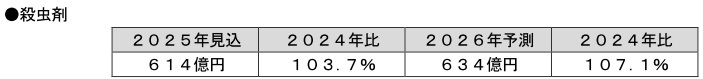殺虫剤は、ハエ・蚊用、ゴキブリ用、ダニ・不快衛生害虫用に分けられる。近年は5月から11月頃まで気温が高い状況が続いており、害虫の発生頻度が増えているため、2025年の市場は前年比3.7%増が見込まれる。前年に発売された「ゴキッシュ スッ、スゴイ!」(アース製薬)や「シンカトリ」(大日本除虫菊)は積極的なプロモーションによって、若年層を含む幅広い年代の需要を獲得している。残暑の長期化による需要増加に伴い、メーカーと小売店が協同し、通年での定番商材化を進めている。2026年は、新商品発売による単価上昇によってハエ・蚊用の好調が予想される。また、2024年に西日本エリアで大量発生したカメムシ対策を機に、ダニ・不快衛生害虫用はドラッグストアやホームセンターなどで売り場が広がったことで好調が続くとみられ、市場は2024年比7.1%増の634億が予測される。