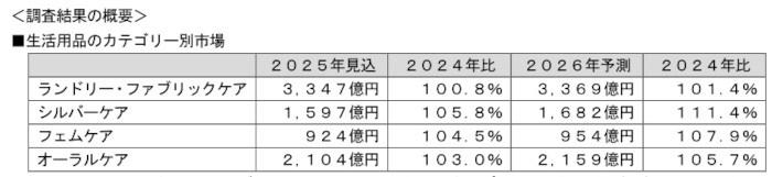 シルバーケアは、2025年は、大人用紙おむつや軽失禁ライナー・パッドのユーザー増加に加え、交換回数を減らせる高機能な高吸収パッドの伸長によって、市場拡大が予想される。高齢化の進行で引き続きユーザーが増加するため、2026年も市場拡大が続くとみられる。