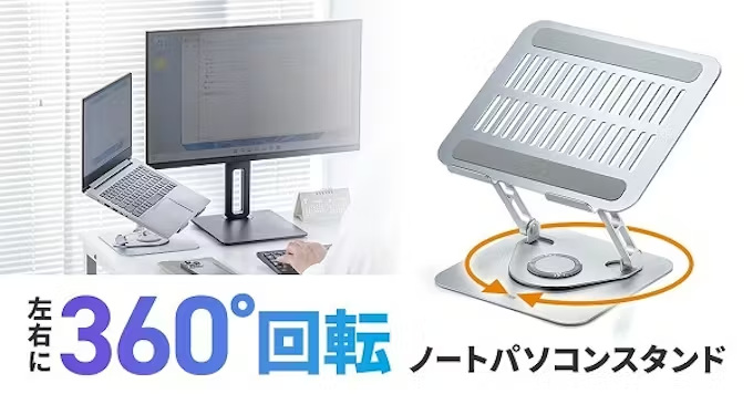 同品は、ノートパソコンを載せて使えるデスクトップスタンド。パソコン使用時の視線が高くなり、姿勢が正され長時間のデスクワークでの体への負担を軽減する。360°自由に回転できる台座を搭載し、スタンドの向きをスムーズに調整できる。他の人に画面を共有したり、メインモニターの横にノートパソコンを設置する際に便利だとか。