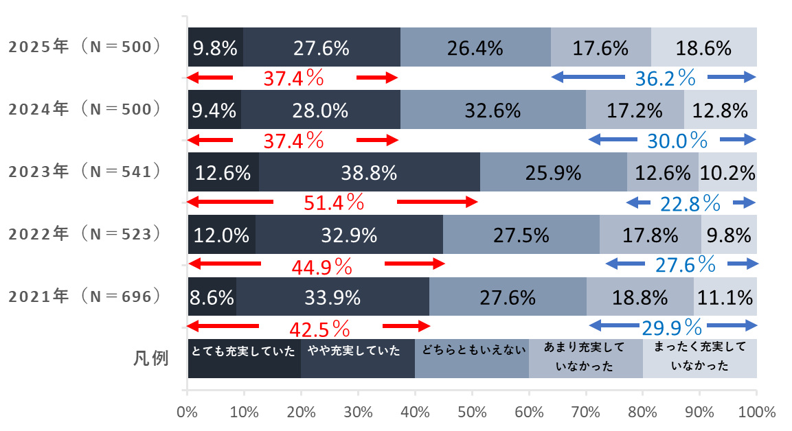 生活の充実度調査2025、昨年「生活が充実していた」人は前年横ばいの37.4%、若年層とシニア層で充実度のギャップ広がる