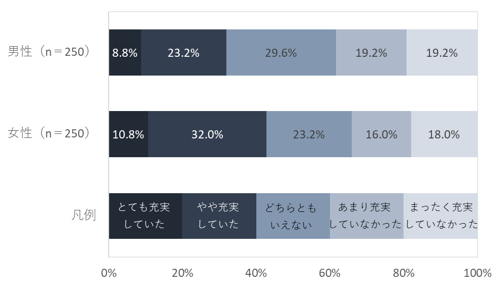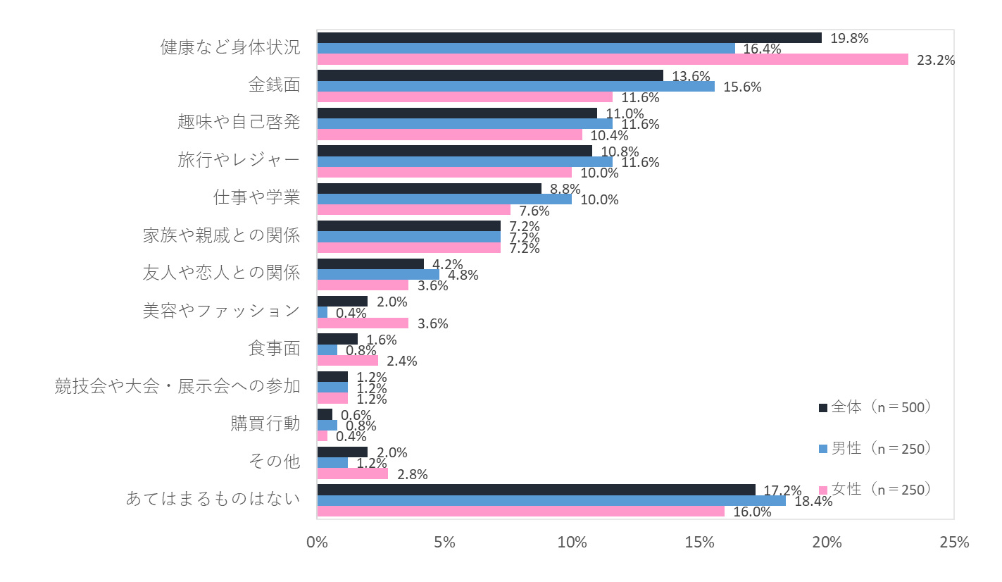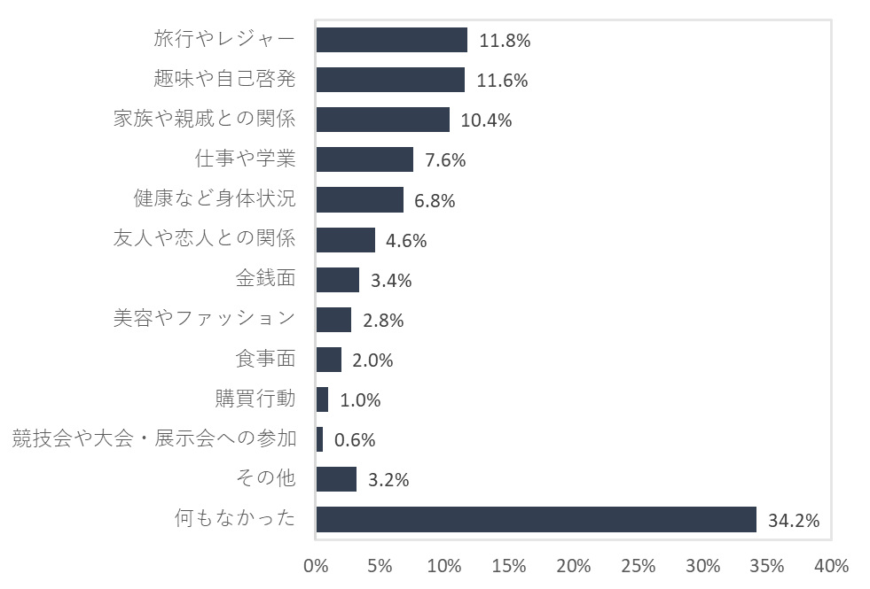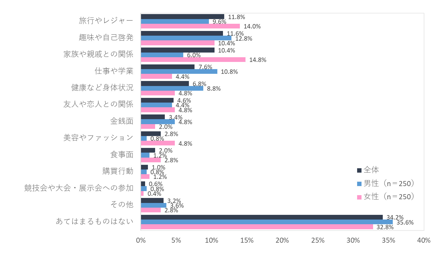 最も充実していたことについて男女別にみると、男性では「趣味や自己啓発」(12.8%)と回答した人が最も多かった一方で、女性では「家族や親戚との関係」(14.8%)がトップになった。2位・3位も、男性は「仕事や学業」(10.8%)、「旅行やレジャー」(9.6%)、女性は「旅行やレジャー」(14.0%)、「趣味や自己啓発」(10.4%)となり、男性と女性で充実していたことの順位が異なる結果になった。
