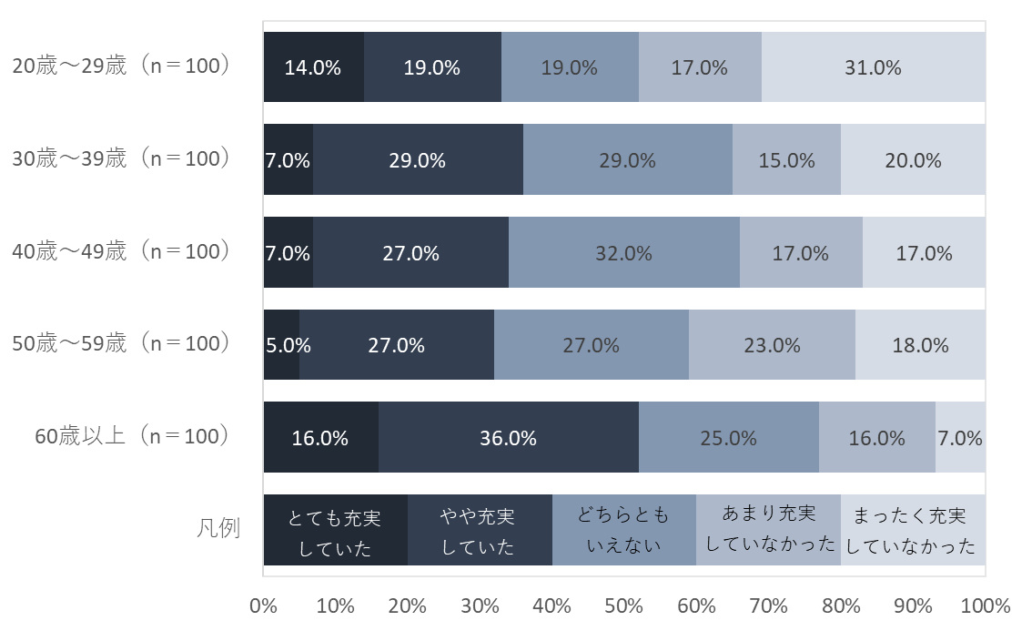 年代別にみると、「生活が充実していた(とても充実していた+やや充実していた)」との回答が最も多かったのは60歳以上で52.0%となり、他の世代を大きく引き離し5割を超えた。一方、「生活が充実していなかった(まったく充実していなかった+あまり充実していなかった)」の回答では、20代がトップで48.0%となり、若年層と60歳以上のシニア層で生活の充実度にギャップがあることが浮き彫りとなった。