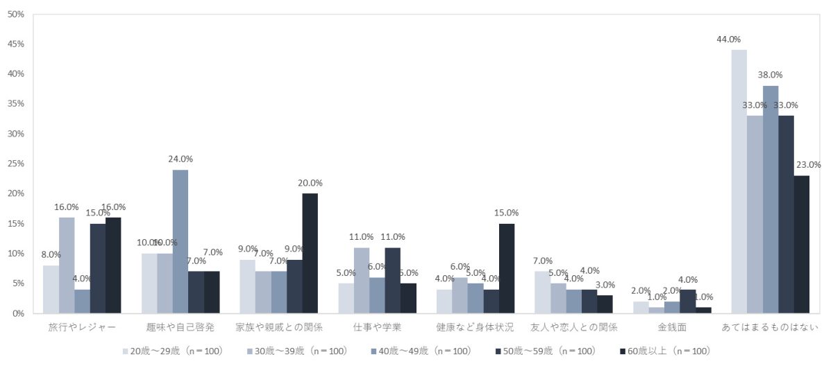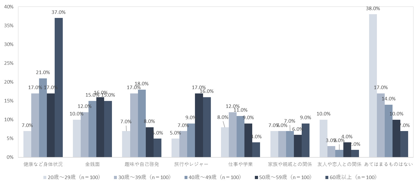 年代別にみると、60歳以上では「健康など身体状況」、20代では「あてはまるものはない」と「友人や恋人との関係」の割合が際立って高いことが明らかになった。特に若年層で、SNS中心の関係に生きづらさを感じていたり、将来に夢や希望を持てない若者が増えている実態が垣間見れる結果となった。この他には、「趣味や自己啓発」は30代・40代、「旅行やレジャー」は50代・60歳以上の割合が高い傾向がみられた。