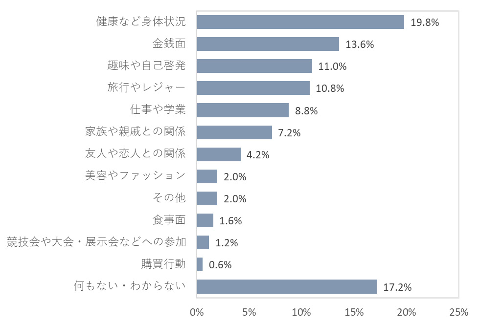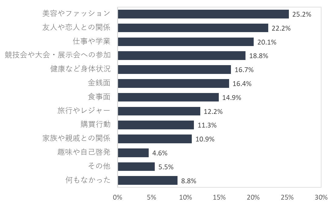 「生活が充実していた(とても充実していた+やや充実していた)」と回答した人の昨年1年間で最も充実していたことは、「美容やファッション」がトップで25.2%だった。次いで「友人や恋人との関係」(22.2%)、「仕事や学業」(20.1%)、「競技会や大会・展示会への参加」(18.8%)と続き、これらの充実感が生活の充実度をより高めていることが示唆された。全体では上位に入っていた「旅行やレジャー」は8位、「趣味や自己啓発」は11位にとどまっている。