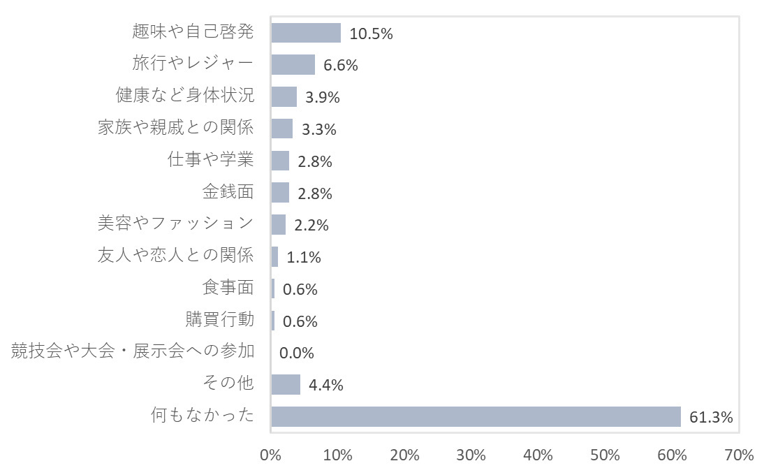 一方、「生活が充実していなかった(あまり充実していなかった+まったく充実していなかった)」人の1年間で最も充実していたことは、「何もなかった」が最も多く61.3%だった。その中でも、「趣味や自己啓発」(10.5%)は10%を超えており、推し活など自分の趣味に関わることは充実していたと感じる人が一定数いたことがわかった。