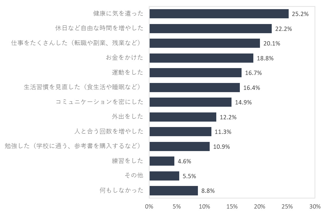 「2025年1年間で最も充実していたことは何か」で回答したことを充実させるためにしたことは、「健康に気を遣った」(25.2%)がトップとなった。次いで、「休日など自由な時間を増やした」(22.2%)、「仕事をたくさんした(転職や副業、残業など)」(20.1%)、「運動をした」(16.7%)、「生活習慣を見直した(食生活や睡眠など)」(16.4%)と続いている。2025年の夏は記録的な高温が続いたことから、「健康に気を遣った」という人が多かったと思われる。