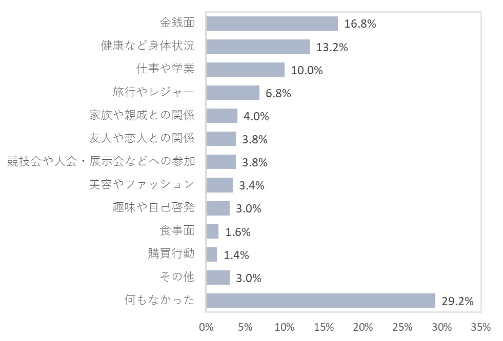 2025年1年間で最も充実していなかったことは、「何もなかった」が29.2%で最多となった。以下、「金銭面」(16.8%)、「健康など身体状況」(13.2%)、「仕事や学業」(10.0%)、「旅行やレジャー」(6.8%)と続いた。中でも「金銭面」については、2024年の調査(13.2%)に比べて割合が増加しており、2024年から続く物価高に加え、2025年は主食である米の価格が高騰したことも充実度に影響していると推察される。
