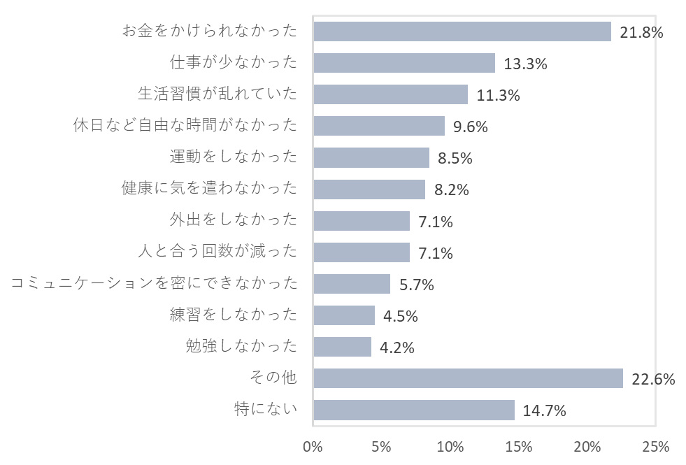 「2025年1年間で最も充実していなかったことは何か」で回答したことが充実しなかった理由では、「お金をかけられなかった」が21.8%でトップだった。2025年も生活にかかわる様々な商品・サービスの価格が上昇したことで、思うようにお金をかけられず、生活の充実度が低下したことがうかがえる。2位以下は、「仕事が少なかった」(13.3%)、「生活習慣が乱れていた」(11.3%)、「休日など自由な時間がなかった」(9.8%)と続いている。
