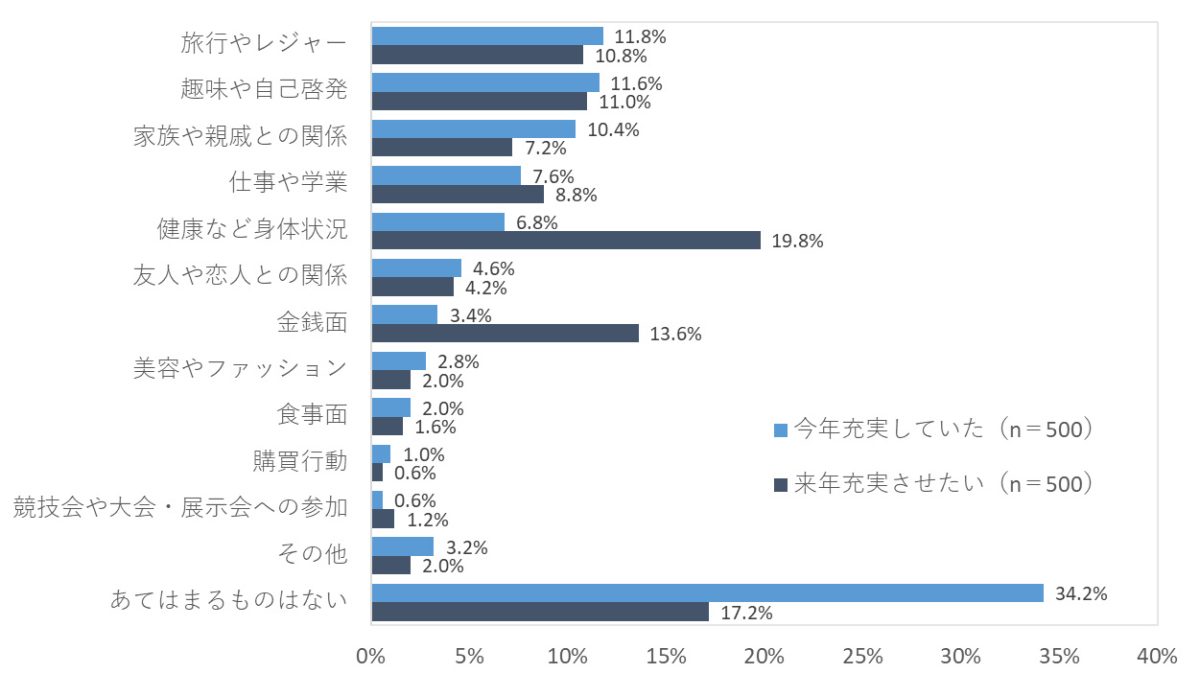 2025年に最も充実していたことと2026年に最も充実させたいことを比較した結果、「健康など身体状況」(13.0ポイント増)と「金銭面」(10.2ポイント増)が大きく割合を伸ばしていた。この2つの項目が、2026年の生活充実度を高めるためのカギを握っていると思われる。一方、大きくポイントを下げたのは「あてはまるものはない」が17.0ポイント減、「家族や親戚との関係」が3.2ポイント減となった。