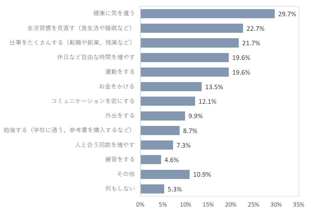 「2026年に最も充実させたいこと」のために何をするかを聞いたところ、最も多かったのは「健康に気を遣う」で29.7%だった。次いで「生活習慣を見直す(食生活や睡眠など)」(22.7%)、「仕事をたくさんする(転職や副業、残業など)」(21.7%)、「休日など自由な時間を増やす」(19.6%)、「運動をする」(19.6%)の順となった。2026年も自然災害の脅威が続くものとみられ、生活を充実させるために「健康に気を遣う」「生活習慣を見直す」との回答が上位に挙がったと思われる。