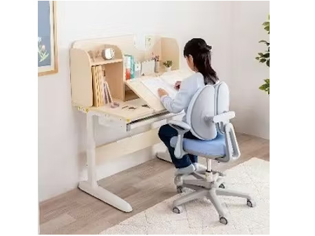 おすすめポイントは、成長に合わせて高さを調整できるとのこと。角度を調整できる天板で猫背を防ぐという。勉強に集中できる多機能設計となっている。