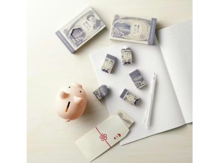 旧千円札に見立てた小箱に、2種類のケースデザインの消しゴム2個入り。プレゼントやお土産にもぴったりとなっている。