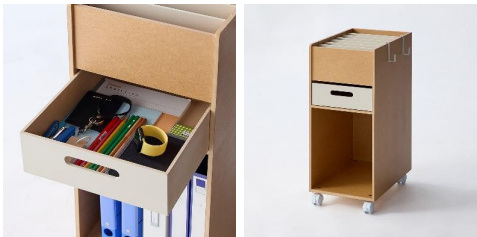 「受験サポートB4ファイルラック」では、塾教材に多いB4サイズのテキストやプリントを折らずに収納できる奥行きで、一般的な家具では防げなかった「はみ出し」や「平積み」による視認性の悪さを解消した。教材の表紙が見えるように立てて収納できるため、子どもが直感的に必要なものを取り出すことができ、「教材を探す」という無駄な時間と労力から解放される。家族の憩いの場であるリビングでの学習時にも雰囲気を壊さないナチュラルなデザインにこだわった。勉強する時だけ横に引き寄せ、終わればサッと片付けられるキャスター付きとなっている。