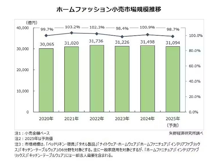矢野経済研究所、ホームファッション小売市場に関する調査、2025年の市場規模は前年比98.7%の3兆1094億円と減少予測