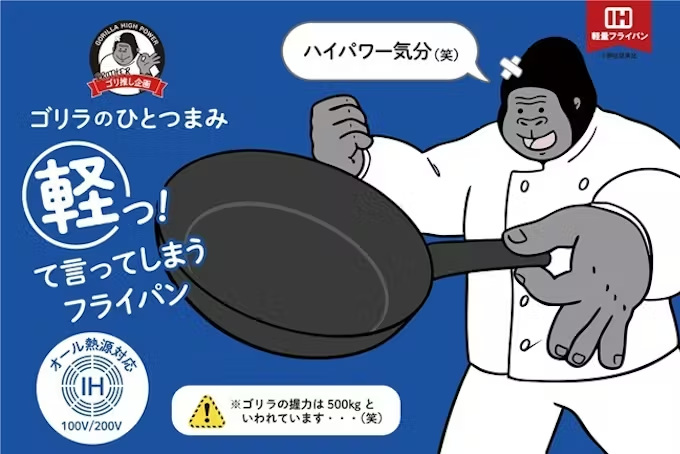 「まるでゴリラのようなハイパワー気分を味わえる」ことをコンセプトに開発した軽量フライパン。昨年2月にガス火専用の軽量フライパン「ゴリラのひとつまみ」を発売し、「ずっと持っていても手首が痛くならない」「軽いから洗う時にも楽」「握力の弱い女性でも使いやすい」など、好評の声が多く寄せられたという。今回、IHでも使いたいという消費者の声に応えて、オール熱源仕様の「ゴリラのひとつまみ オール熱源タイプ」をラインアップに追加して発売する。