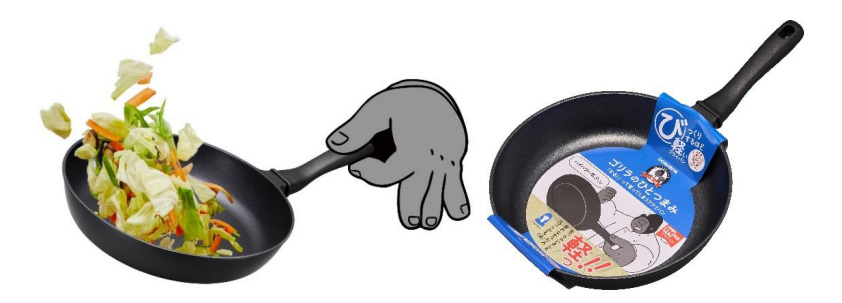 商品特長は、IHを含むオール熱源に対応しているとのこと。同製品は、軽量なアルミ製を採用しつつ、ダイキャスト製法により強度も確保することで軽さと丈夫さを両立した。ダイキャスト製法とは、金属を型に流し込んで成形する製法で、箇所によって厚みや形状を自在に調整できる。火をかける底面は十分な厚みを確保しながら、直接火が当たりにくい側面は薄くするなど、不要な部分を削ぎ落して軽量化を実現した。フライパン26cmのサイズで重さはわずか475g。本体スリーブはゴリラが人差し指と親指だけで持つイラストを表示することで、軽さを表現し、「軽っ!!言っちゃいました 言わなかった人すごいかも(笑)」とデザインされている。フライパンの内面には、ふっ素コーティングが施されているため、こびりつきにくく手入れがしやすいとのこと。また、フライパン内面にネジ頭が出ない設計で、汚れが溜まりにくく洗う時にも引っ掛かりがないという