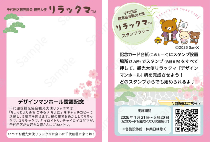 デザインマンホールの設置を記念して、記念スタンプラリーを開催する。記念カード台紙にスタンプを押して、リラックマのマンホール絵柄を作成できる。千代田区観光案内所、KANDA SQUARE、テラススクエアの3施設を回ってもらい、合計6色のスタンプを押すと記念カードが出来上がる。