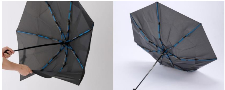商品特長として、独自開発した青い骨は、最大4本を連結した構造になっており、強靭な強さと安定性を実現。全形態に耐風仕様の傘骨を採用し、風速30m/s(風速30m/sとはトラックが横転するレベルの強風で大変危険。あくまで傘骨の高強度実証試験なので、強風時の使用は避けてほしいという)の試験もクリア。突然の強風時にも安心して使用できる強さを備えている。