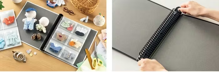 「カード用ポケット」は、トレーディングカードなどの収納に適したカード用ポケット。片面タイプは透明厚手ポケットで、9枚までカードを収納できる。両面タイプはカードが映える黒台紙とはっきり見える高透明シートで、片面に9枚ずつ、合計18枚まで収納可能。ポケットサイズは、保護用のスリーブに入れたままのカードも収納できる寸法で、大切なコレクションをきれいに保管できる。