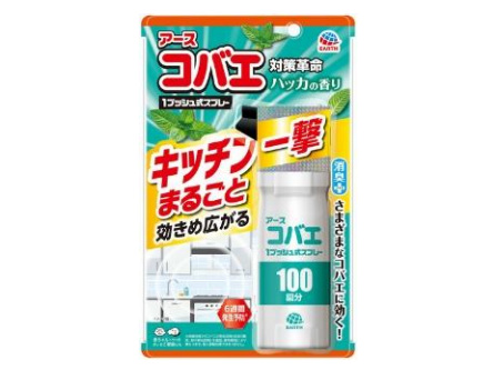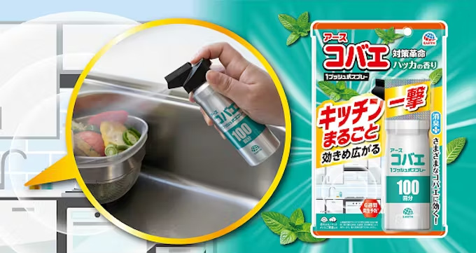 「アースコバエ キッチンまるごと1プッシュ式スプレー 100回分」は、キッチンのコバエ対策に特化した製品。1プッシュするだけで薬剤がキッチン全体に広がり、飛び回るコバエを駆除する。ゴミ箱や生ゴミなどに群がるコバエには、約20cmの距離から直接噴射することで速効駆除が可能。同社試験では、メッシュケージ内のコバエに対し、1プッシュ10秒未満で約50%がノックダウンする速効性が確認されている。キッチンでの使用を考慮し、ハッカの香りを採用している。赤ちゃんやペットがいる家庭でも使用できる。コバエの発生源(ゴミ箱や排水口など)に噴射することで、約6週間にわたりコバエの発生を予防する(使用環境によって効果は異なる。侵入抑制効果はない)。ショウジョウバエ、ノミバエ、キノコバエ、チョウバエといった、さまざまなコバエに効果を発揮する。