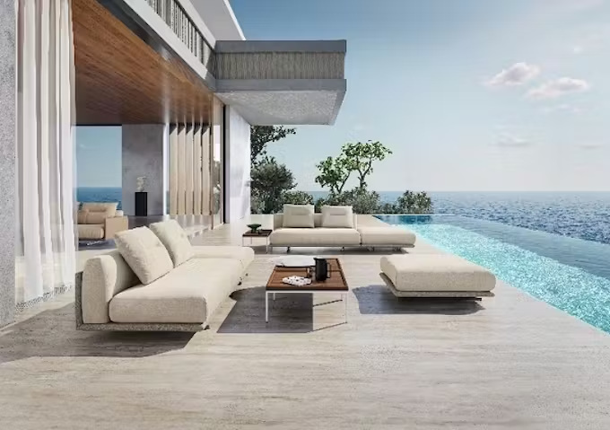 用途に応じて屋内用・屋外用それぞれの張地コレクションから選択でき、ロルフベンツならではの快適な座り心地をアウトドアシーンにも広げた、新しいソファスタイルを実現した。モジュール構成によって、住まいや過ごし方に合わせた自由なレイアウトが可能になっている。