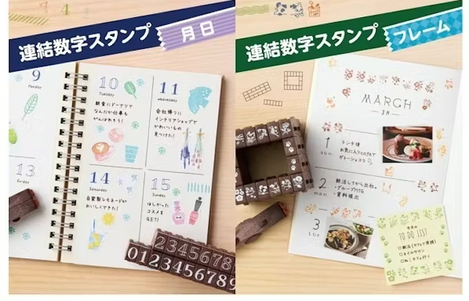 「連結数字スタンプ」は、本体の凹凸をはめ合わせて、タテヨコに連結することができる組み替え自由なスタンプ。2023年には、ノートや手帳への記録が便利にできる小さなサイズの数字「ナンバリング」と「万年カレンダー」の2タイプを発売した。