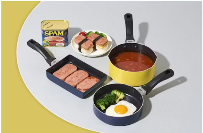 今回発売する「SPAM ミニフライパン」は、アメリカンポップなデザインのミニサイズフライパンとのこと。SPAM ミートを焼くにもちょうど良いサイズ感で、朝食などに便利な16cmのフライパンと玉子焼き器、麺類や汁物に適した16cmのミルクパンの3種展開となる。