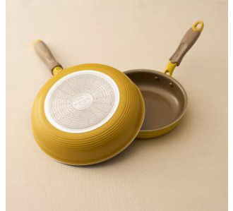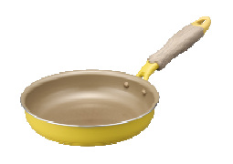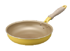 春らしく明るい印象を受けるイエローの中でも、ややグレーを加え落ち着いた色味の「メロウイエロー」を採用した。ハンドルにはナチュラルな木目転写を施し、陽だまりのようなやさしい印象のフライパンを目指した。外面塗装のマットな質感と、フライパン下部に施したラインも相まって、主張しすぎない存在感が見慣れたいつものキッチンをパッと明るくしてくれる。
