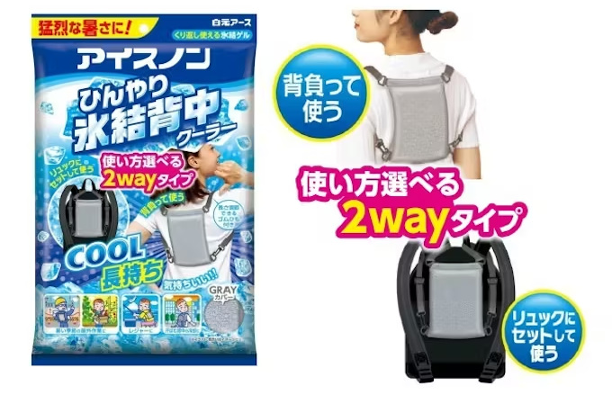 「アイスノン ひんやり氷結背中クーラー」は、冷凍庫で凍らせるとカチカチに固まる「氷結ゲル」を使用した、くり返し使えて背中をしっかり冷やせる冷却商品。専用カバーに氷結ゲルを入れて、そのまま背負う、またはリュックに取り付けて使用する2way仕様となっている。また、専用カバーは、タオルのような綿100%の生地に加えて、長さ調節可能なアジャスター付きのゴムひもを採用しているので、自身にあった着用感で使用でき、着脱もスムーズとのこと。さらに、冷気を逃さない断熱シート付きで冷たさが長持ちする。暑い季節の屋外作業やレジャー、リュックを背負った際の汗ばむ背中の冷却など様々なシーンで使用できる。パッケージには「猛烈な暑さに!」のメッセージと共に商品名を大きくあしらい、背中を冷やす商品としてお客様に認知してもらい、長く愛される商品を目指す。