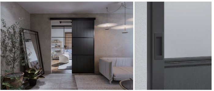 引手をリニューアルした「シャレード」は、操作性が向上し、空間に馴染むスマートな意匠になった。カラーはフレームと同系色のホワイト、シルバー、ブラックをラインアップする。