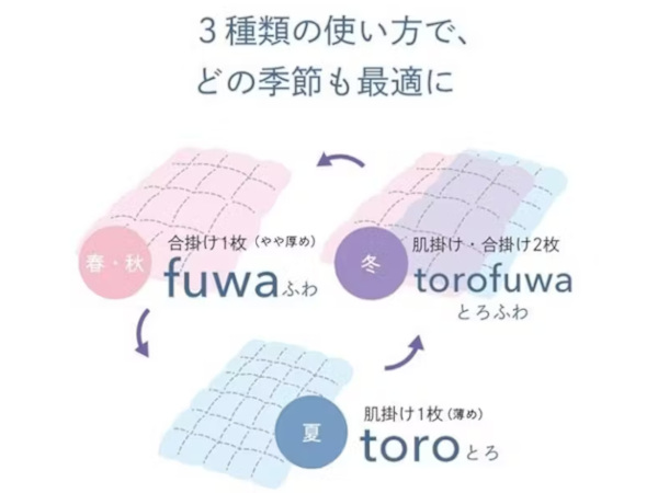 ふんわり軽くあたたかな羽毛ふとんは、吸湿性や放湿性に優れ、寝床内を理想的な環境にコントロールする天然の調湿・調温機能を持っている。この天然ダウン(羽毛)の特長を活かした「#003 torofuwa 通年使い羽毛ふとん」は、品質・気持ちよさ・使いやすさにこだわり、オールシーズン快適に使える2枚合わせの羽毛掛けふとん。暑い夏は薄めでとろとろな肌ざわりの「toro肌掛けふとん」、春・秋はちょうどいい厚さでふんわり軽い「fuwa合掛けふとん」、寒い冬はtoro・fuwaの2枚合わせの3種類の使い方ができ、季節に応じて理想的な睡眠環境を整える。