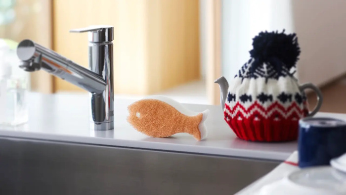 1998年の発売以来、4半世紀以上消費者に愛用されている「おさかなスポンジ」は、そのアイコニックな形と使い心地のよさが特長となっている。おさかなの形が手になじみ握りやすく、長めのサイズでコップの底まで届く。ナイロン不織布・ウレタン・脱膜ウレタンの3層構造で、汚れ落ち、泡立ち・泡持ち、水切れに優れている。
