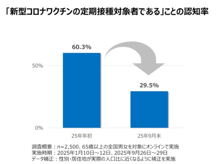 2025年度「新型コロナワクチン定期接種」の認知率は29.5%、2024年度定期接種と比べて約半分に減少